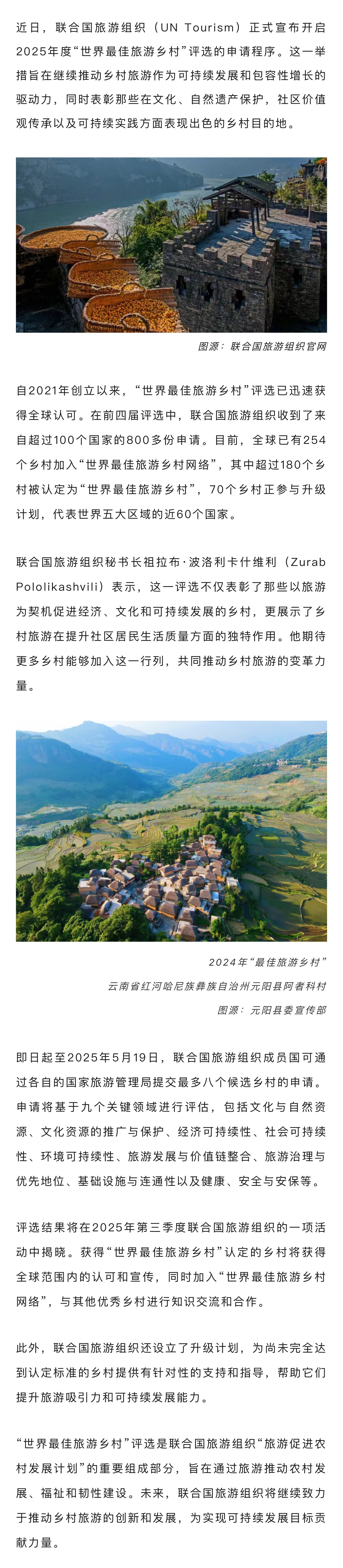 联合国旅游组织开启2025年度“世界最佳旅游乡村”评选申请