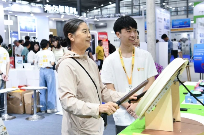 图为2024年10月27日,老人在博览会上体验乐龄鼓。新华社记者 梁旭/摄