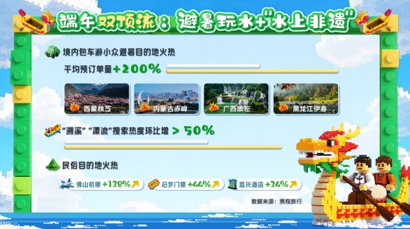 携程近日发布 2025 年端午旅游报告,在前接五一后有暑假的背景下,今年端午小长假可谓是好玩还不贵,国内多地酒店均价较五一假期有所下降。从玩法来看,民俗体验、周边短途游、避暑游成为三大核心增长引擎。“水”字当头,国门热门景区前十中,近一半为水上乐园类景区。而有“水”上非遗之称的龙舟赛更是端午民俗游目的地的吸人利器,佛山、汨罗、聊城等地热度飙升。在六一儿童节叠加效果下,亲子家庭成为了端午出游的主力军,GMV前50的景区中家庭亲子类景区占比近90%,亲子订单占整体旅游订单的25%。