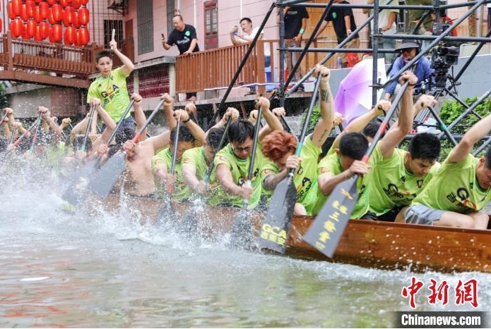 比赛现场,赛道上浪花翻滚,各支龙船队伍纷纷亮出水上极限漂移绝技:加速、甩尾、急停、避险、折返……一条龙船上,鼓手、“扒手”、舦手等四五十人配合得默契十足。龙船在狭窄的河涌里流畅转弯,看似惊险,实则“张弛有度”。欢呼声、呐喊声、锣鼓声回荡在佛山叠滘水乡,不绝于耳。