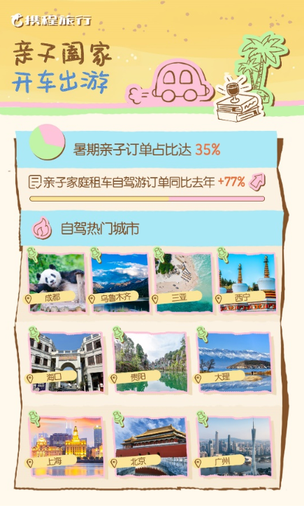 暑期旅游的核心客群依旧少不了亲子家庭。暑期亲子订单占比达35%,租车自驾成亲子家庭出游的热门之选,报告显示今年暑期亲子家庭租车自驾游订单同比去年增长77%。暑期国内自驾热门城市依次为成都、乌鲁木齐、三亚、西宁、海口、贵阳、大理、上海、北京、广州。