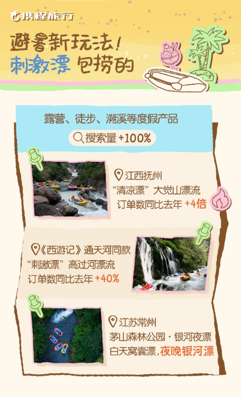 除传统避暑游之外,户外挑战和自然探索,如露营、徒步、溯溪等度假产品今夏也受到游客热烈追捧,搜索量同比增长超过100%。其中,衍生出各种新玩法的漂流成为今年暑期大势,位于江西抚州的“清凉漂”大觉山漂流,体感温度仅18-26度,同比去年订单数增长超4倍;有《西游记》通天河同款之称的高过河漂流则全长5公里,落差200米的“刺激漂”揽获年轻人喜爱,成交订单数同比增加40%;“白天窝囊漂,夜晚银河漂”,江苏常州茅山森林公园的银河夜漂也以出片的夜间美景成功出圈。