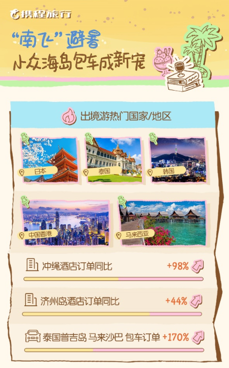 和国内避暑游大热趋同,出境游表现亮眼的目的地同样具有清凉属性,日本、泰国、韩国、中国香港、马来西亚位列前五出境游热门目的地。其中,短线海岛游增长强劲,日本冲绳酒店订单同比去年增长98%,韩国济州岛酒店订单同比增长44%。包车去海岛度假也成为了暑期不少游客的共同选择,泰国普吉岛、马来沙巴等地订单量同比增长170%以上。此外,海外长线包车游心智持续攀升,澳大利亚、意大利、德国等地订单增势明显。