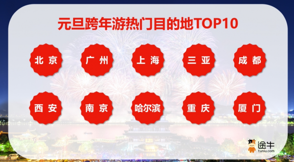 跨年游热门目的地方面,北京、广州、上海、三亚、成都、西安、南京、哈尔滨、重庆、厦门等备受途牛用户青睐。其中,上海迪士尼度假区、广州长隆度假区、珠海长隆度假区、北京环球度假区等主题乐园,以及北京首钢园、古北水镇,南京新街口、夫子庙,上海南京路步行街、外滩,广州永庆坊、广州塔,西安古城墙、大唐不夜城等兼具文化韵味与潮流氛围的城市地标成为跨年游用户的热门选择。
