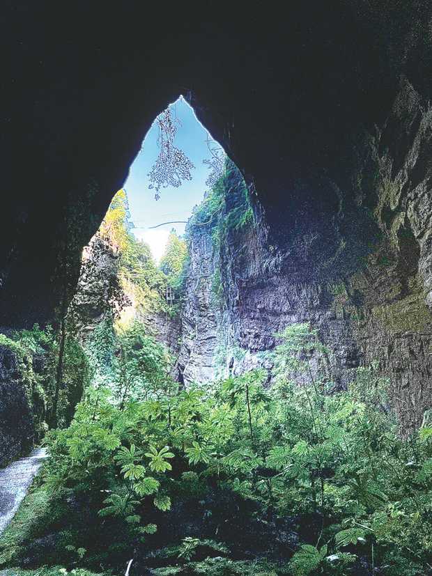 She wasn't kidding. After we walked along a stone-paved path into the sinkhole, the road passed a patch of dense wood as it gradually disappeared into a cave.