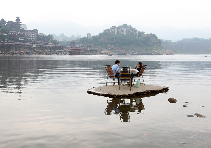 People drinking tea and relaxing by the river in Chongqing's Ciqikou, May 1, 2012. [Photo by Liu Song/China Daily]
