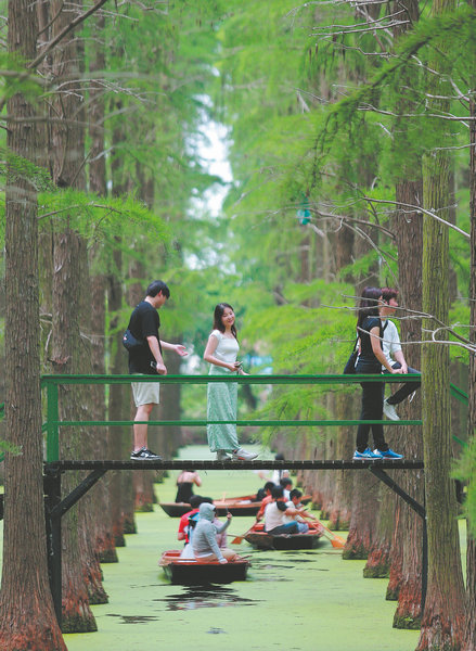 Tourists enjoy the coolness at a "forest above water" scenery spot in Luyang Lake Wetland Park in Yangzhou, Jiangsu province, in early summer. [Photo/Xinhua]
