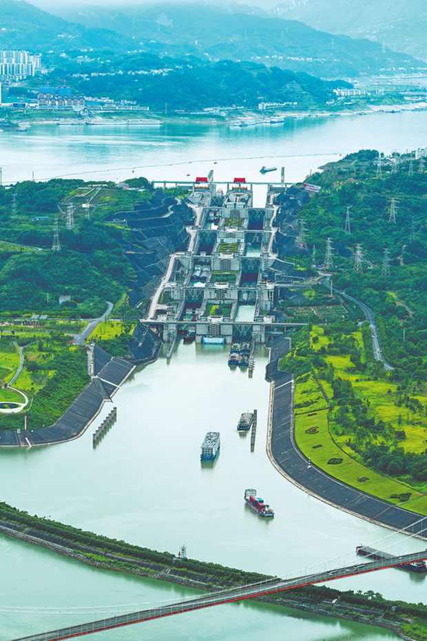 An aerial view of the Three Gorges Dam's five-tier ship locks, where cargo ships and cruise vessels pass through. [Photo provided to China Daily]