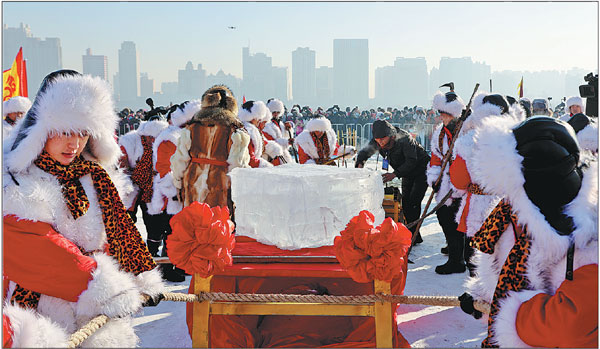 Workers in traditional local costumes pull the first block of ice from the Songhua River in Harbin, Heilongjiang province, on Dec 7. The folk ceremony marks the start of the ice harvest season. [Photo provided to China Daily]