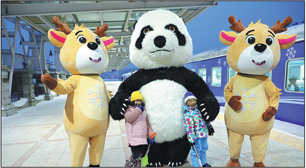 Young tourists take photos with cartoon characters at the Harbin railway station before getting on the snow-themed train to Yabuli. [Photo provided to China Daily]