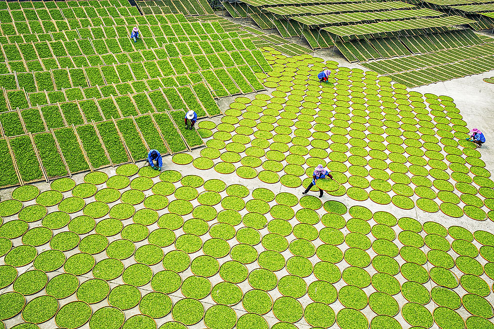 And people are busy picking tea leaves in southeast China's Fujian Province. In the city of Fuding, known for its locally-produced white tea, farmers are seen busy working on the terraced tea gardens.