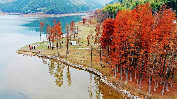 In every late autumn, dawn redwood trees in the Gutan Reservoir, East China’s Zhejiang province dress in gold clothes. [Photo/IC]
