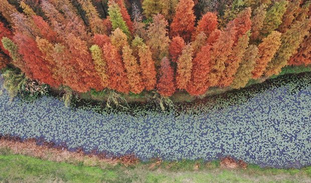 In the Sihong Hongze Lake Wetland Scenic Area, East China’s Jiangsu province, the dawn redwood forest is dressed in gorgeous colors in early winter. From an aerial view, it looks like a spectacular red ocean. In recent years, relying on its dawn redwood resources, Sihong county has integrated forests with tourism to develop rural tourism. Covering 20 hectares , the dawn redwood forest in the scenic area is a heaven for wild animals and draws many nesting migratory birds.
