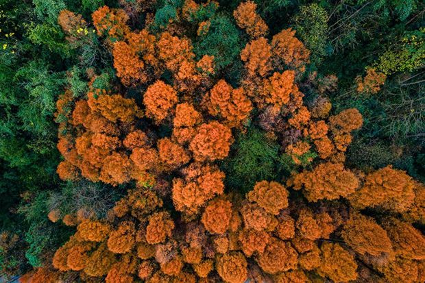 An aerial view of colorful dawn redwood trees on the Xuedou Mountain in Shaoxing city, East China’s Zhejiang province. [Photo/IC]