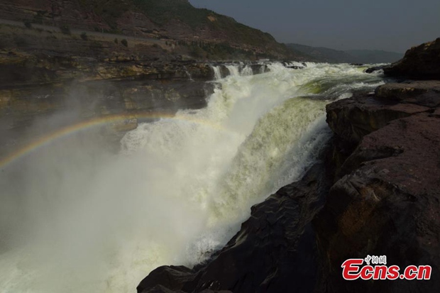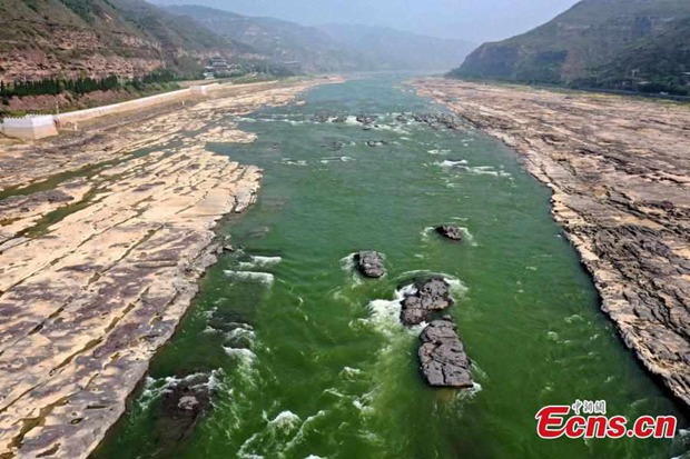 The color of Hukou Waterfall of the Yellow River turns into crystal green in Jixian County, Linfen City, north China's Shanxi Province(Photo: China News Service/Lu Guiming)