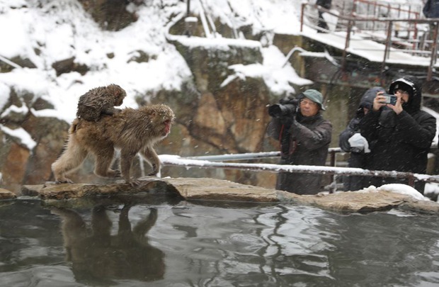 Snow monkeys, also known as Japanese macaques, enjoying hot spring in Japan's Nagano, attract many visitors taking photos.
