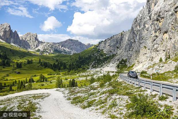 A panoramic view of the Passo Sella mountains in the Dolomite Alps at Corvara, Italy. Rock climbing routes are not far from roads, which means people can easily have access to many different routes in a short period of time.[Photo/VCG]