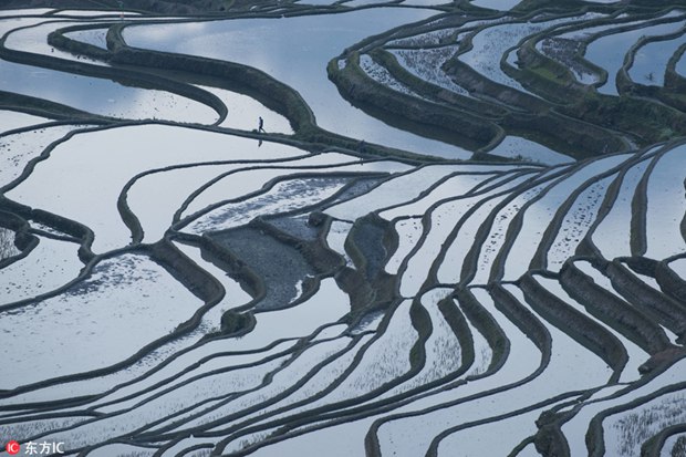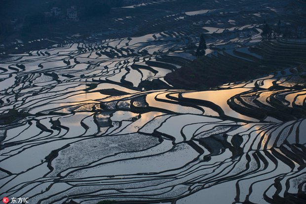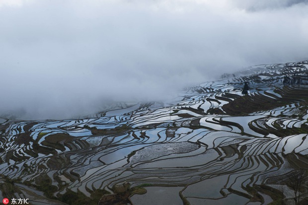 Landscape of terraced rice fields of the Yuanyang rice terraces in the morning mist in Yuanyang county, Honghe Hani and Yi autonomous prefecture, Southwest China's Yunnan province