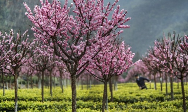 A photo taken on March 2, 2020, shows a refreshing spring scene of tea fields in Hongfu Mountain, Pingli county, Shaanxi province. Apricot flowers and cherry blossoms are in full bloom after a recent rainfall in the Qinba mountainous area.[Photo/Xinhua]