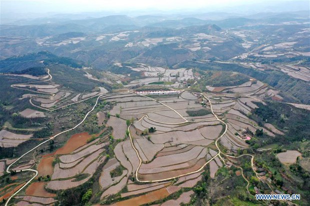 Aerial photo taken on April 14, 2020 shows terraced fields near Taiping Village in Lushi County of Sanmenxia, Central China's Henan province.