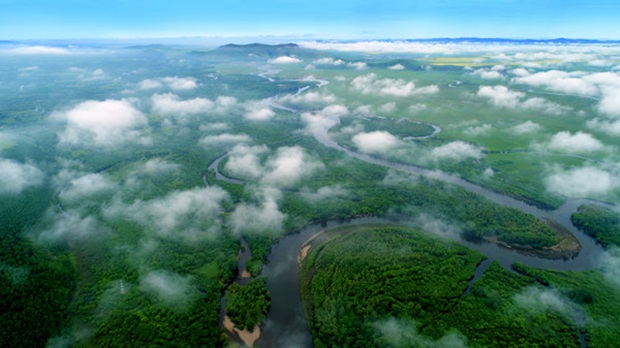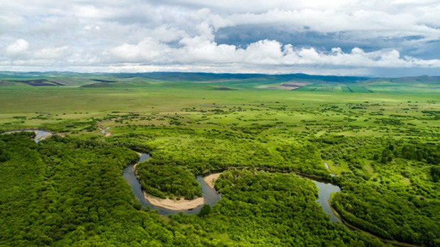 An aerial panoramic view of the verdant Erguune Wetland. [Photo provided to chinadaily.com.cn]
