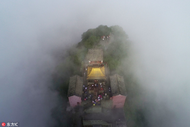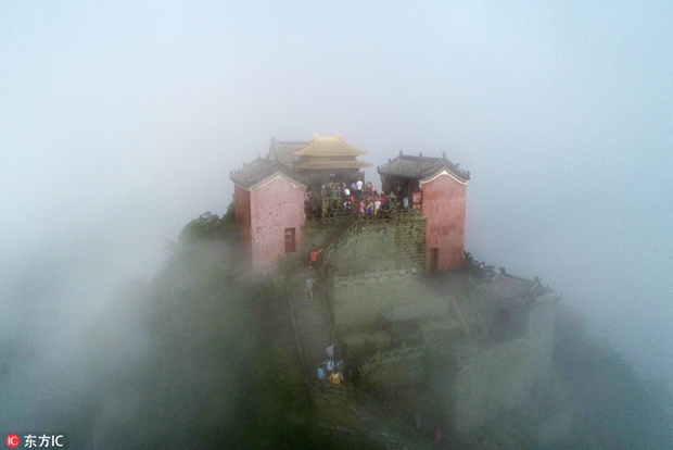 Aerial view of Wudang Mountain, home to the famous complex of Taoist temples and monasteries, surrounded by mist and cloud in Shiyan city, Central China's Hubei province[Photo/IC]