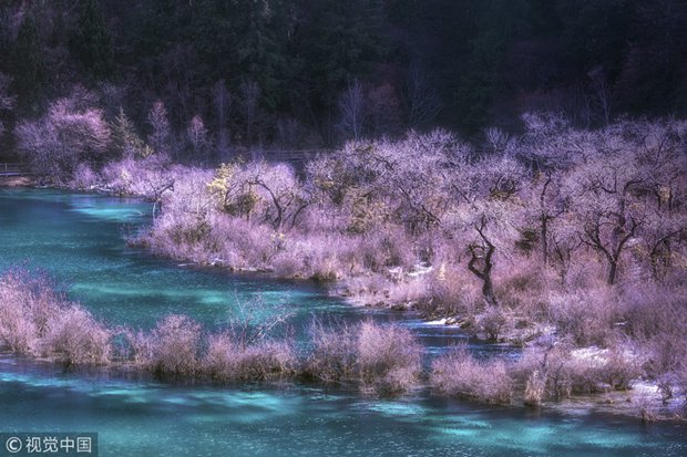 Lavender and turquoise blue color the spring scenery at the Jiuzhaigou Valley Scenic and Historic Interest Area. [Photo/VCG]