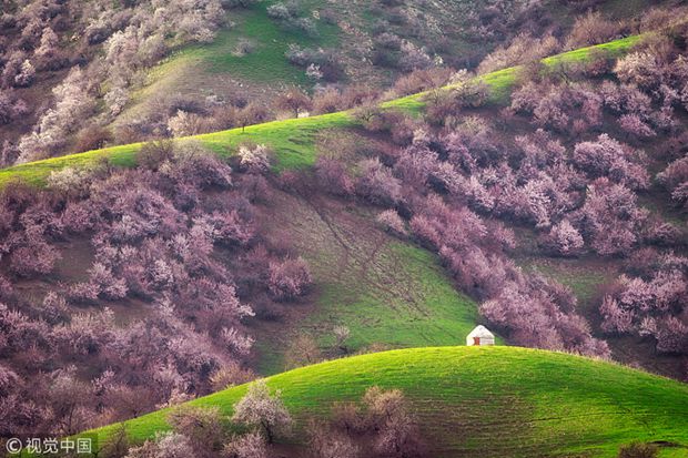 Apricot blossoms in Northwest China's Xinjiang Uygur autonomous region seem to roll up and down the landscape. [Photo/VCG]