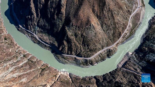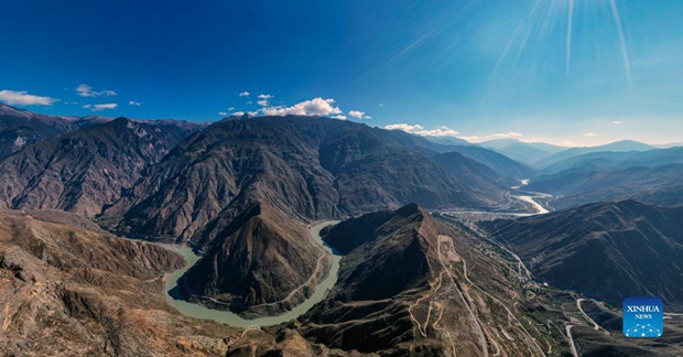 Aerial photo taken on Oct. 27, 2021 shows a bend of the Jinsha River, the upper section of the Yangtze River, in southwest China. (Xinhua/Jiang Wenyao)
