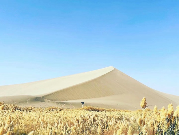 Photo taken on Oct. 16, 2021, shows the desert scenery of Mingsha Mountain and the Crescent Spring scenic area in Dunhuang, northwest China’s Gansu Province. (People's Daily Online/Lv Qiang)