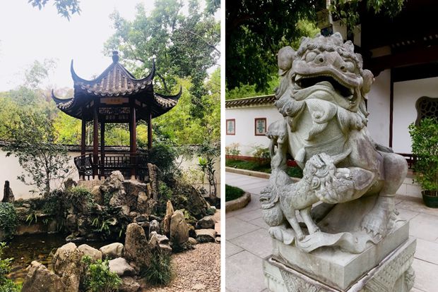 Pagoda and stone guardian at Kaihua Temple on the West Lake Park island.[Photo by Elyar Najmehchi for chinadaily.com.cn]