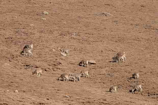 A group of blue sheep came down the hillside to graze and find water. Some of them lied down to rest after a hearty meal. The blue sheep is under first-class state protection in China and is a major prey for the snow leopard. Whenever you see them hanging around, it's highly possible that you will see a snow leopard lurking around as well.