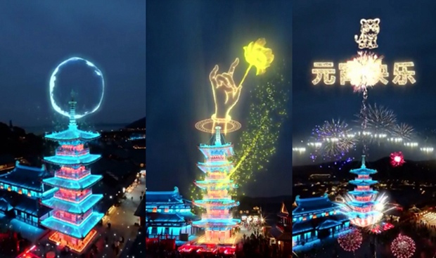 In Nianhuawan scenic area in Wuxi, people can witness the fantastic water column circling the Nianhua Pagoda, the leafy linden tree shining at the top of the tower, and hundreds of lanterns flying in the sky in celebration of the New Year.