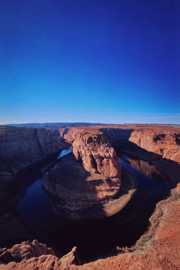 Only seven miles away from the Antelope Canyon lies the Horseshoe Bend in Glen Canyon National Recreation Area. The Colorado River makes a wide sweep here, creating a roughly 305 meters deep, 270º horseshoe-shaped bend.