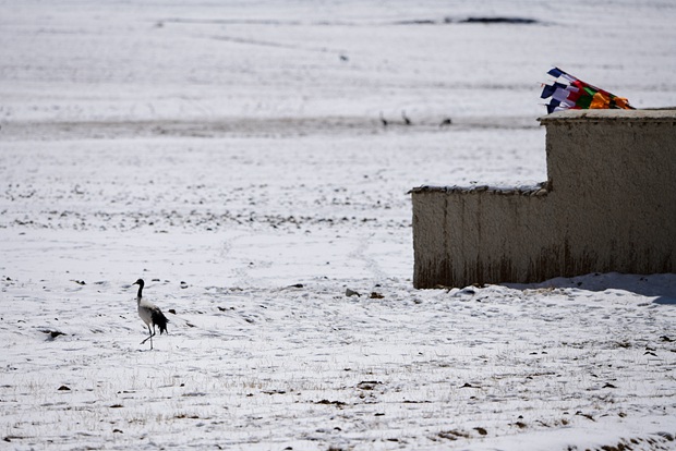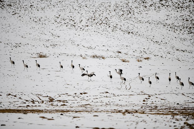 Black-necked cranes across the Qinghai-Tibet Plateau are known as "elves of the plateau." Tibetans regard these graceful birds as "holy" and draw them on thangka.