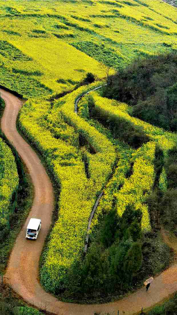 The sudden snow that hit most of the area of south China is finally gone, and the spring takes the stage with its vibrant colors. In southwest China's Yunnan Province, the rapeseed flowers have turned to an endless ocean carpeting Luoping County. The yellow and green fields wave into each other, which looks like a crayon drawing from afar.