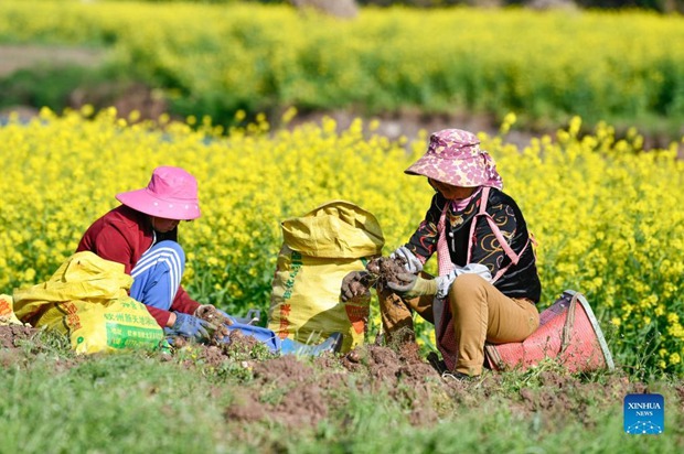 Farmers harvest taroes in Panzhou, southwest China's Guizhou Province, March 7, 2022. In the process of consolidating poverty alleviation achievements and promoting rural revitalization, Guizhou has actively guided farmers to change farming methods and develop suitable agriculture industry in mountainous areas. At the same time, Guizhou made efforts to integrate agriculture with tourism and cultural industries, which helped to increase agricultural efficiency and farmers' income. (Xinhua/Yang Wenbin)