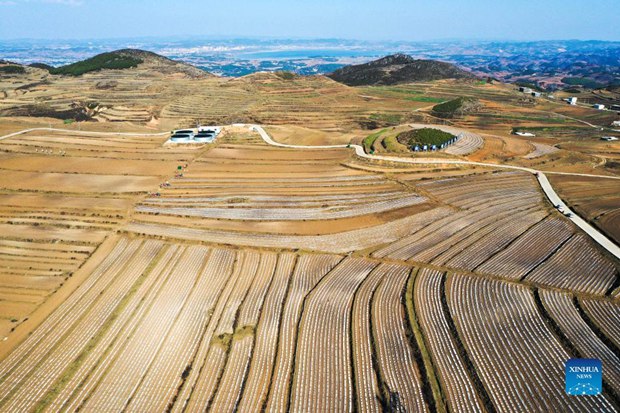 Aerial photo taken on March 8, 2022 shows farmers working in the fields in Weining, southwest China's Guizhou Province. In the process of consolidating poverty alleviation achievements and promoting rural revitalization, Guizhou has actively guided farmers to change farming methods and develop suitable agriculture industry in mountainous areas. At the same time, Guizhou made efforts to integrate agriculture with tourism and cultural industries, which helped to increase agricultural efficiency and farmers' income. (Xinhua/Yang Wenbin)
