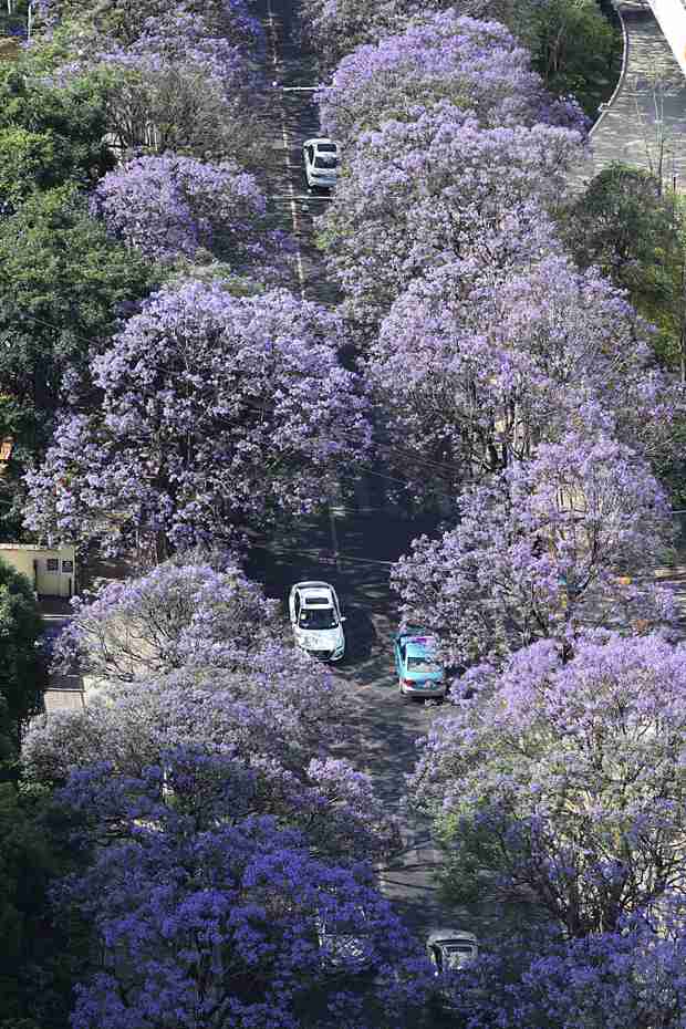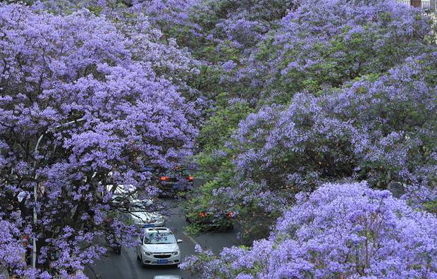 As summer is around the corner, clouds of blue jacaranda are in full bloom in Kunming City in southwest China's Yunnan Province. The "purple clouds" enveloping the streets make the city look like a peaceful dreamland.