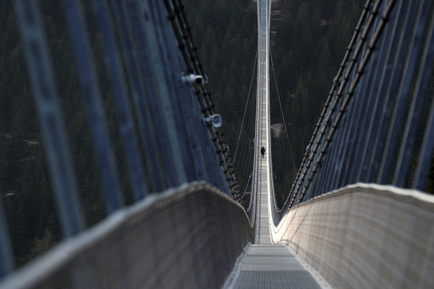 The footbridge is named Sky Bridge 721, and took two years to build. It is suspended by six main supporting ropes and 60 wind ropes, and spans 721 meters (2365.49 feet) across a mountain valley near the Dolni Marava resort.