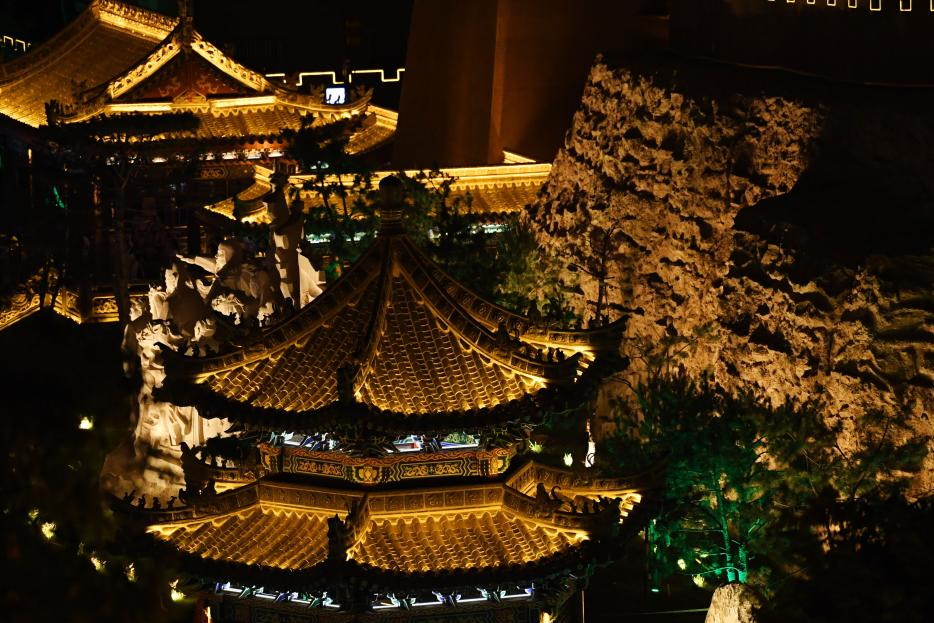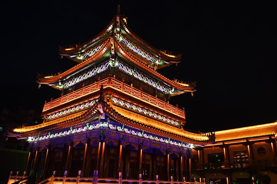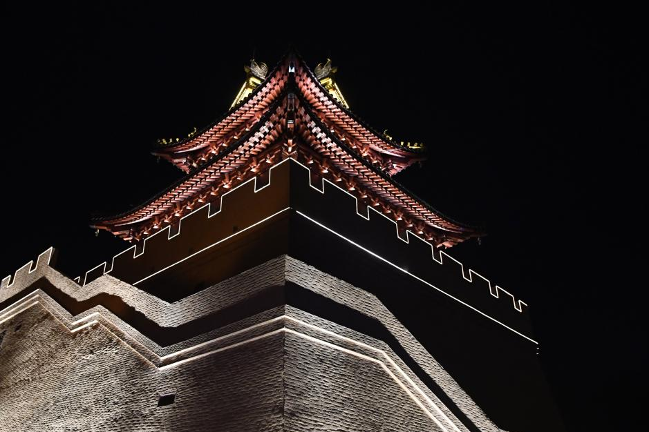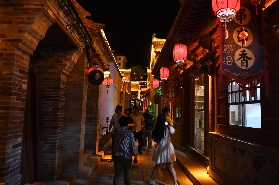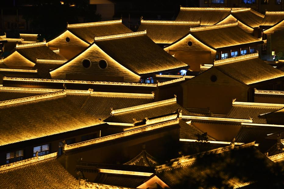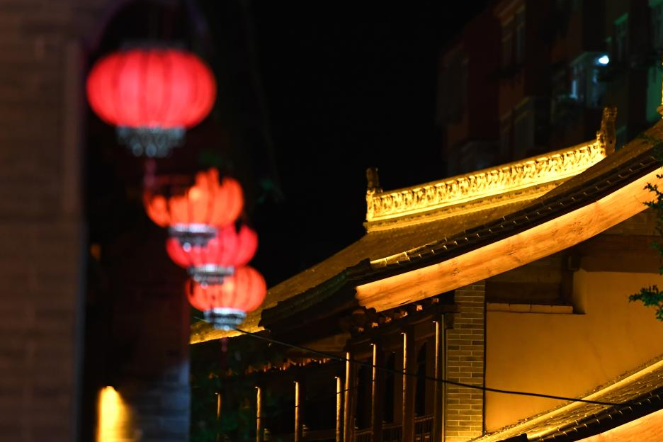 Photo taken on June 9, 2022 shows the night view of Tianshui ancient town in Tianshui City, northwest China's Gansu Province. The ancient town, a block with historical buildings in Tianshui, has been renovated and received tourists for nearly one year. The restoration is in a bid to preserve history and the city's cultural heritage.