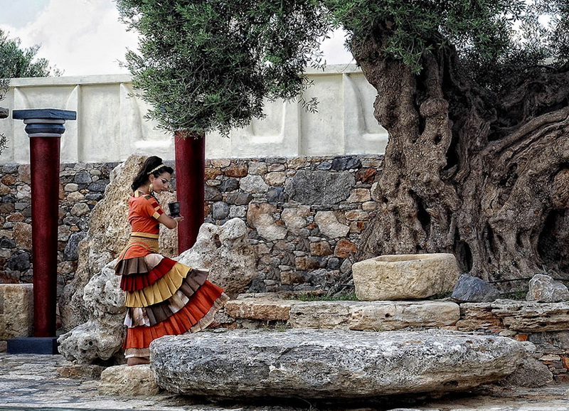 A priestess delivers an offering before the sacred olive tree - Minoan Theater