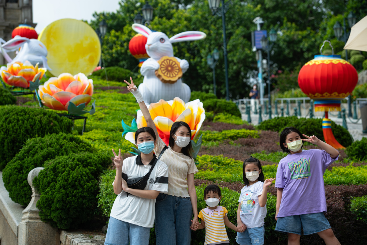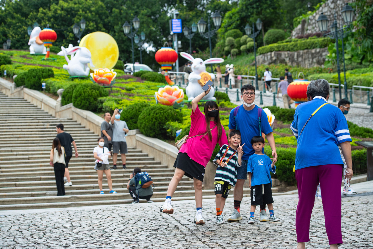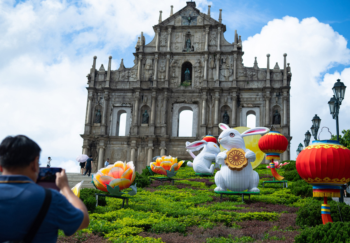 Festive installations in celebration of the upcoming Mid-Autumn Festival are seen in front of the Ruins of the St. Paul's in Macao, South China, Aug 21, 2022. [Photo/Xinhua]