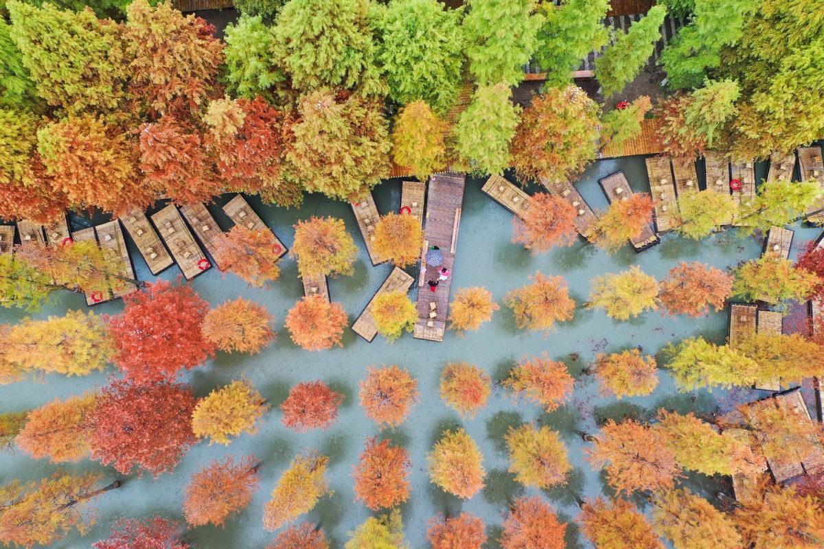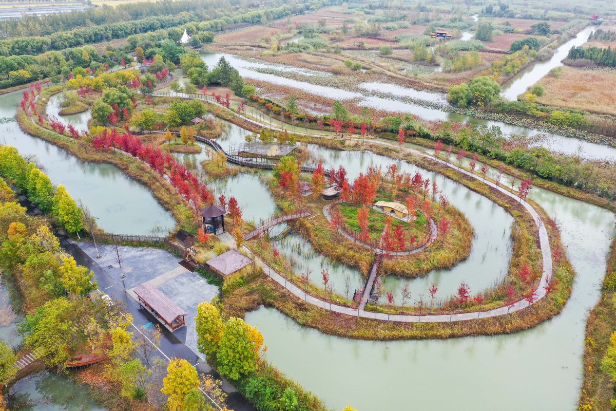 This aerial photo taken on Oct 26, 2022 shows the autumn scenery of Hongze Lake Wetland Scenic Area in Sihong county, East China's Jiangsu province. [Photo/Xinhua]
