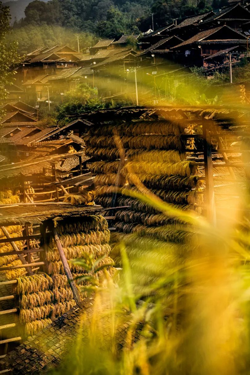 After the autumn harvest each year, the villagers will air the glutinous foliage near the well-ventilated village and the stream. At a glance, Hewei Group surrounds the village along the stream. It is golden and beautiful.