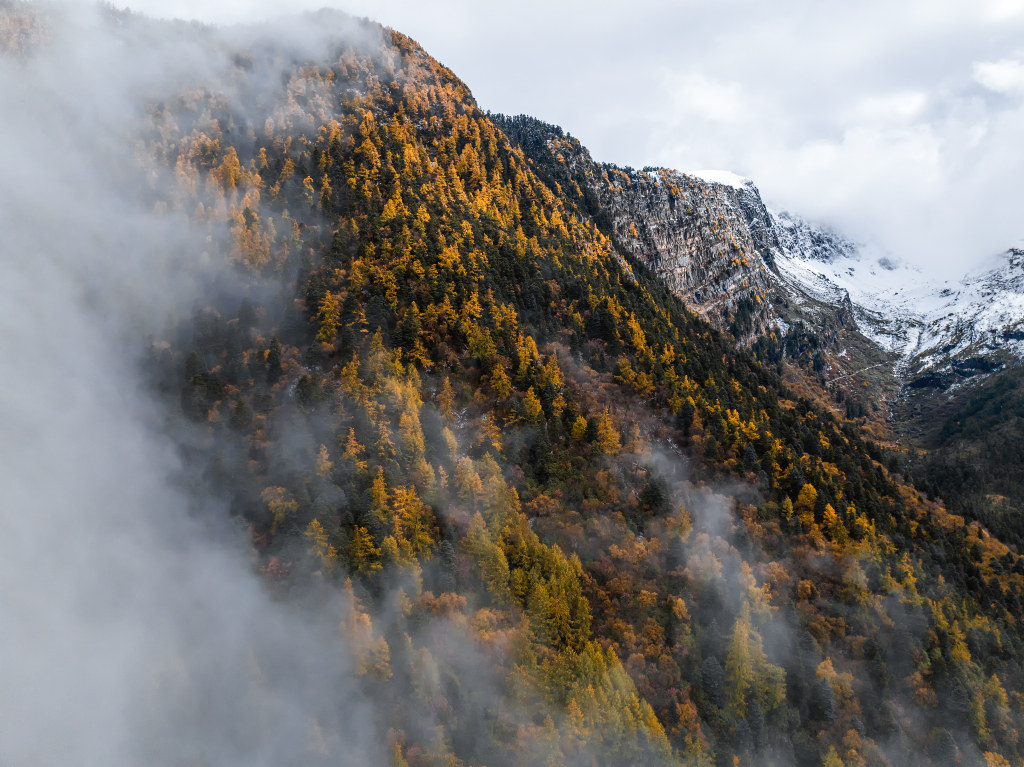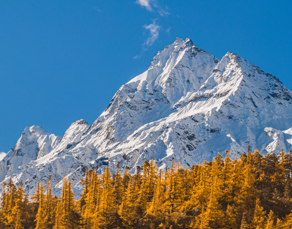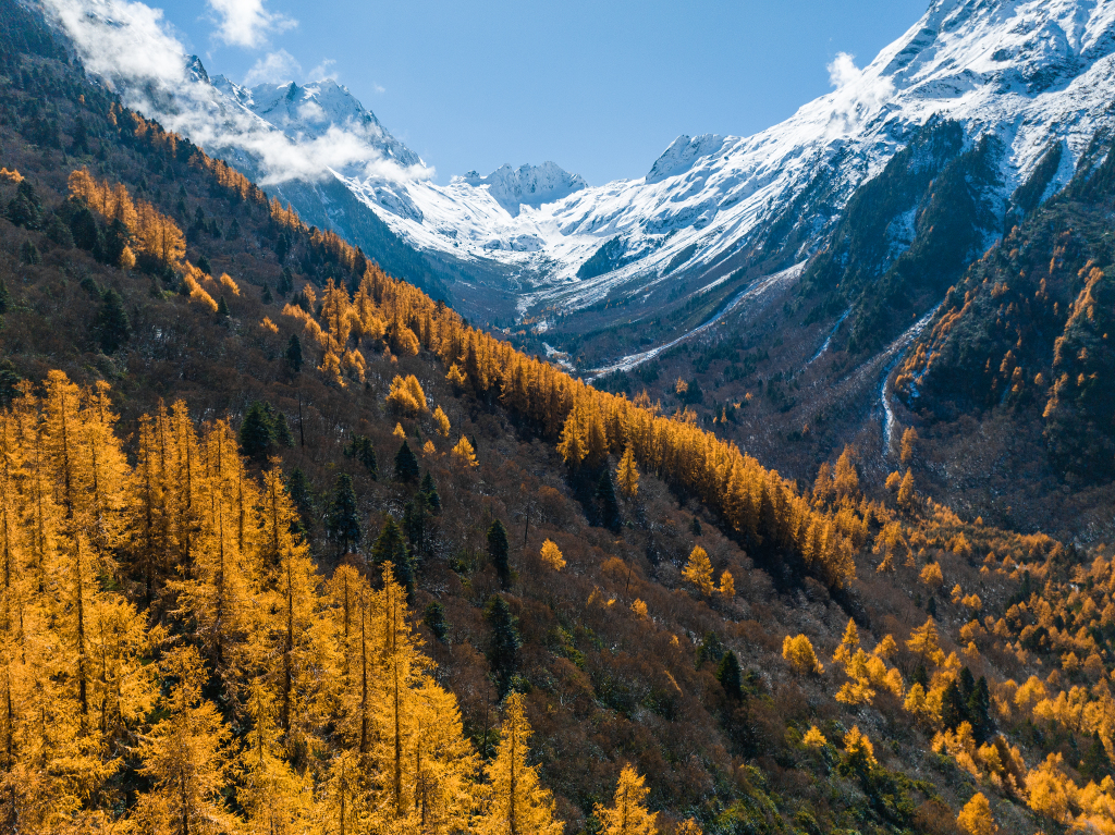 As the temperature drops, forests in the Yarlung Zangbo Grand Canyon in Tibet Autonomous Region have turned golden, as if the snow-capped mountains are wearing a spectacular dress.