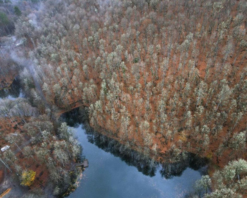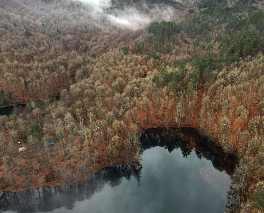 This aerial photo taken on Nov. 27, 2022 shows the autumn scenery of the Yedigoller National Park in Bolu, Trkiye. (Photo by Mustafa Kaya/Xinhua)