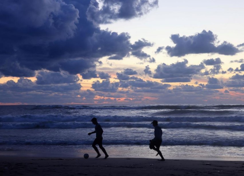 Two young men play football at sunset on the beach of the Mediterranean Sea in Beirut, Lebanon, on Nov. 26, 2022. (Xinhua/Liu Zongya)