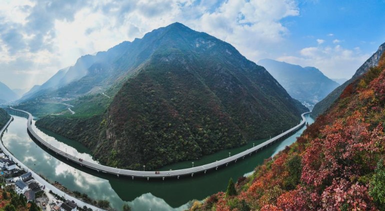 This aerial panoramic photo taken on Nov. 27, 2022 shows a road over water in Xingshan County of Yichang, central China's Hubei Province. (Photo by Zheng Jiayu/Xinhua)