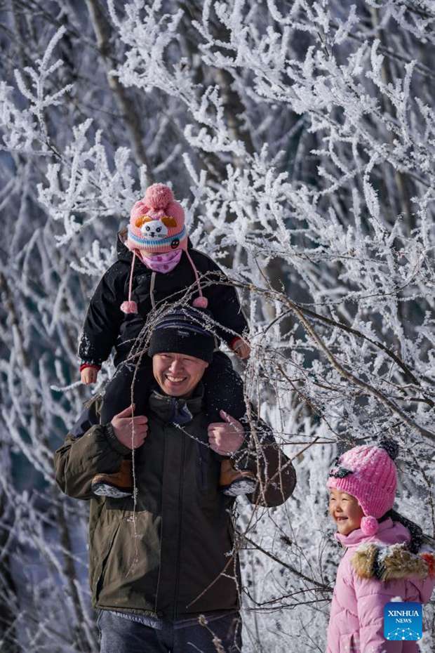 People enjoy the rime scenery near the Songhua River in Jilin City, northeast China's Jilin Province, Jan. 30, 2023. (Xinhua/Yan Linyun)